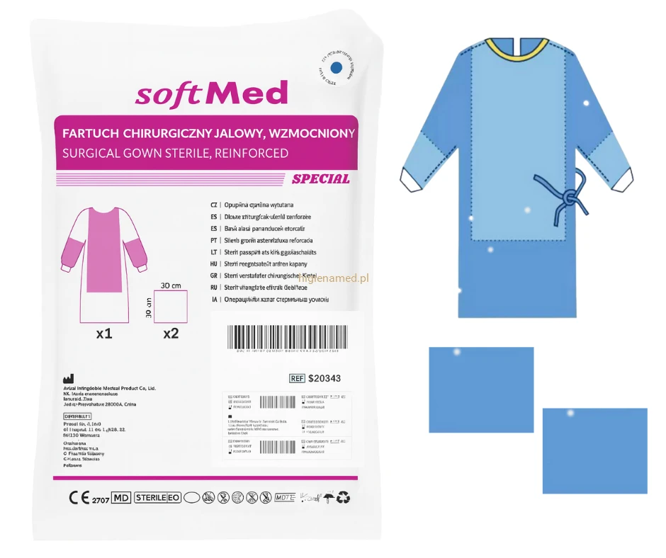 Jałowy, wzmocniony fartuch chirurgiczny w rozmiarze L, zapewniający skuteczną ochronę przed przenikaniem płynów i mikroorganizmów. Wykonany z wielowarstwowej włókniny SMS, gwarantuje komfort pracy i swobodę ruchów nawet podczas długotrwałych zabiegów. W zestawie 2 jałowe ręczniki chirurgiczne o wymiarach 30 × 34 cm.