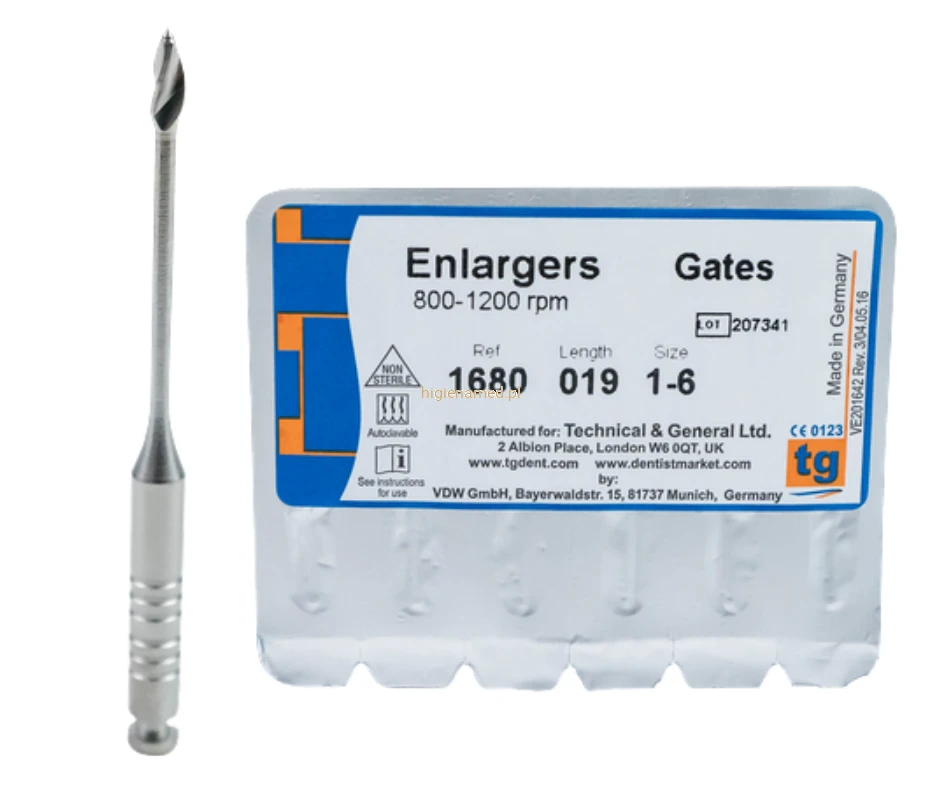 Gates Enlargers TG to precyzyjne narzędzia maszynowe do poszerzania ujścia kanału. Wykonane ze stali nierdzewnej, z nieaktywną końcówką i bezpiecznym punktem przełamania. Zestaw 6 szt. Produkcja: VDW Germany.