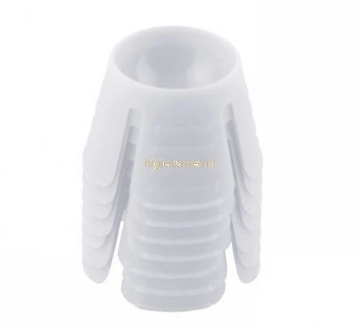 Zestaw 10 jednorazowych kieliszków w kolorze białym, idealnych do odmierzania leków, podawania płynów i innych zastosowań higienicznych w gabinetach i placówkach medycznych.