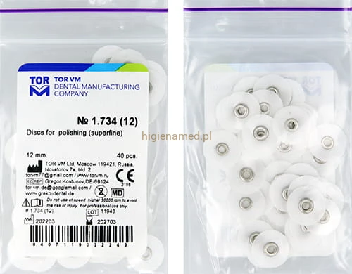 Krążki polerskie TOR VM 1.734 Superfine o średnicy 12 mm to bardzo drobnoziarniste krążki przeznaczone do końcowego polerowania i nadawania wysokiego połysku kompozytom, szkliwu oraz innym materiałom stomatologicznym. Zapewniają doskonałe wygładzenie powierzchni bez zarysowań i bez ryzyka uszkodzenia wypełnienia.