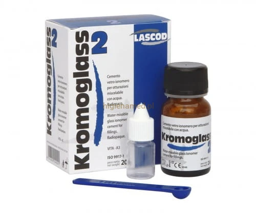Kromoglass 2 to cement na bazie szkła-jonomerowego, rozrabiany z wodą, przeznaczony do precyzyjnego wypełniania ubytków. Idealny do leczenia zębów mlecznych, odbudowy szkliwa .