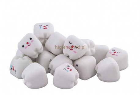 Gumki w kształcie zęba. Idealny prezent dla mniejszych pacjentów, odpowiedni do użytku szkolnego. Wykonany z gumy syntetycznej. Nadają się do ścierania ołówków grafitowych na wszelkiego rodzaju papierach. Miękki, nieścierny materiał. Cztery piękne modele o różnych wyrazistych twarzach. Kolor: biały. Nie zalecane dla dzieci poniżej 3 roku życia.