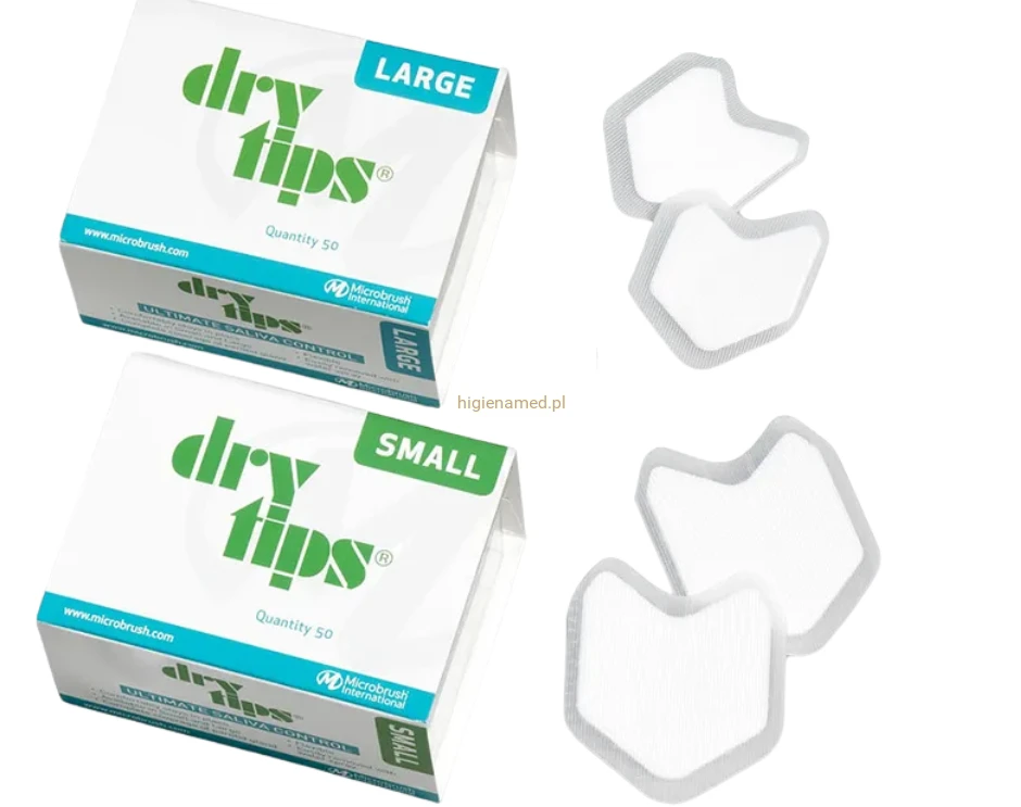 DryTips to policzkowe wkładki chłonne przeznaczone do utrzymania suchego pola zabiegowego podczas procedur stomatologicznych. Umieszczane są bezpośrednio nad ujściem kanału gruczołu ślinowego, gdzie skutecznie pochłaniają ślinę i ograniczają jej napływ do pola operacyjnego.