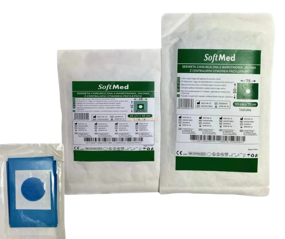Serweta chirurgiczna 45 cm x 45 cm jałowa z otworem przylepnym SoftMed