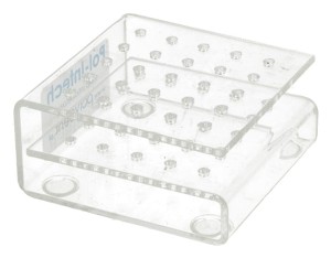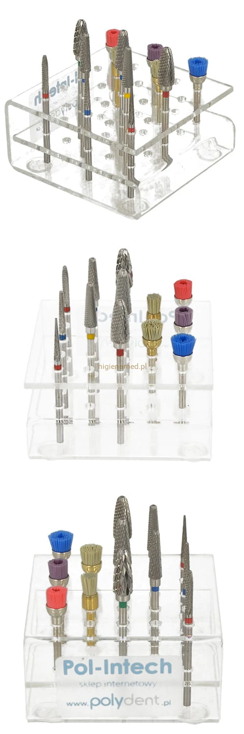 Posiada 25 szt. otworów na frezy, gumki , wiertła HP lub RA (kątnica). Ma niewielkie rozmiary, tylko 6 cm x 6 cm. Podklejony 4 silikonowymi nóżkami zapobiegającymi przesuwaniu. Pokazane na zdjęciach instrumenty obrotowe nie są wliczone w cenę stojaka.
