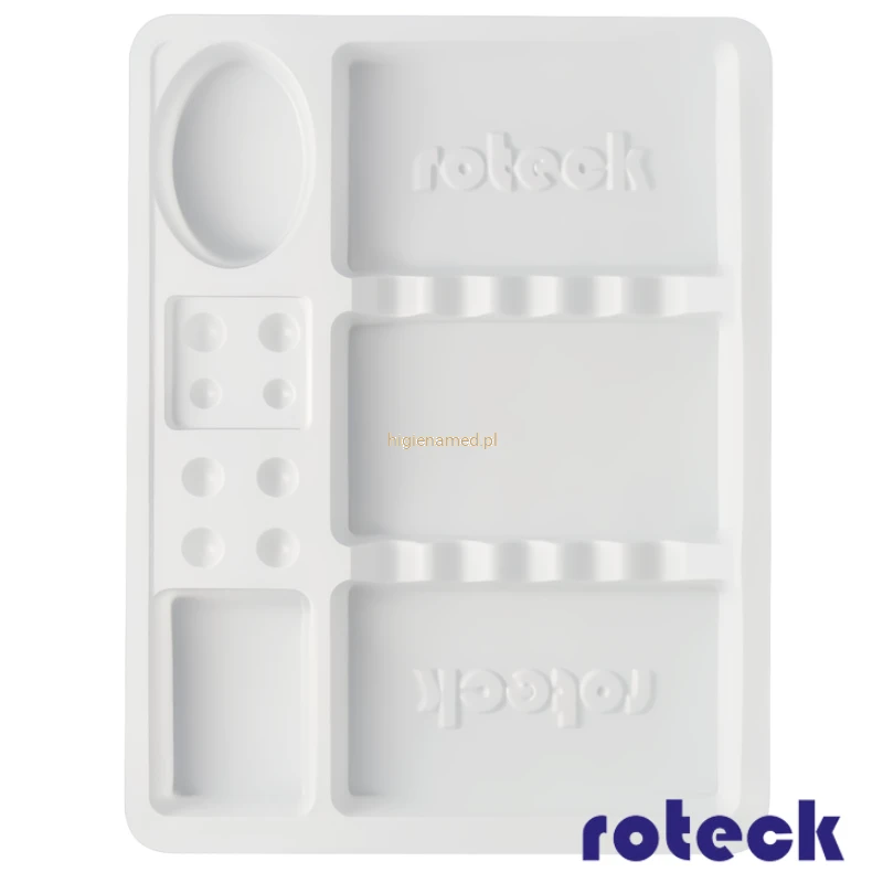 Przemyślany design tych tack oferuje praktyczne przegródki i profilowania na różnego rodzaju narzędzia oraz specjalne wgłębienia na płyny i inne materiały, co znacząco ułatwia organizację pracy. Ich prostokątny kształt oraz wymiary (140mm x 183mm x 17mm) sprawiają, że są one nie tylko poręczne, ale również łatwe do przechowywania i transportu. Dzięki temu, tacki ROTECK świetnie sprawdzą się w każdym profesjonalnym środowisku, gdzie liczy się precyzja oraz higiena.