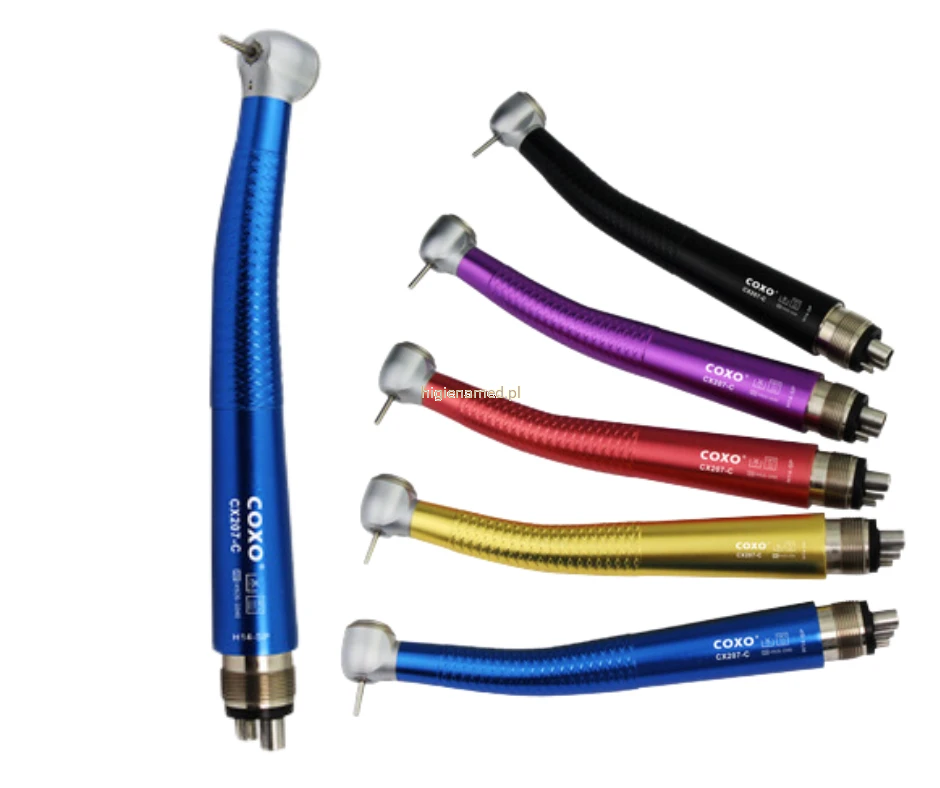 Końcówka turbinowa COXO CX207-C to profesjonalne narzędzie stomatologiczne zaprojektowane z myślą o precyzyjnej i komfortowej pracy w gabinecie dentystycznym. Wyposażona w nowoczesny system button-lock (push button), umożliwia szybką i bezpieczną wymianę wierteł bez użycia dodatkowych narzędzi.
