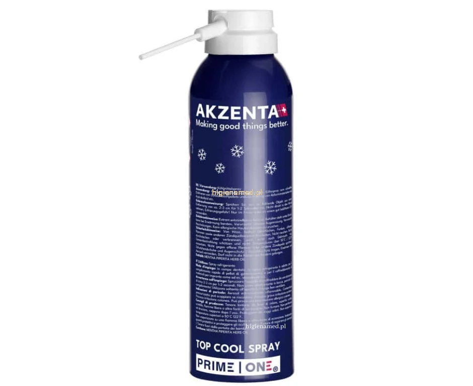 Zimny spray Akzenta TOP COOL o miętowym aromacie, osiągający temperaturę do –50°C. Idealny do zamrażania wałeczków ligniny przy pośrednim teście żywotności zęba oraz do szybkiego chłodzenia wycisków i materiałów termoplastycznych. Wyposażony w aplikator-rurkę dla precyzyjnego użycia. Nie stosować bezpośrednio w jamie ustnej.